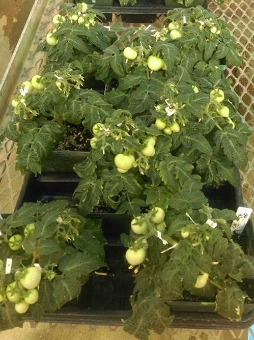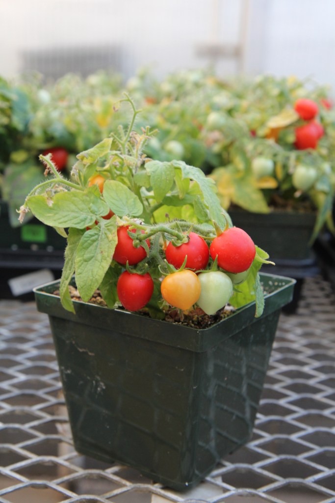Tomato plant (cv. Microtom) and tomato fruits. Photo credit: Ching-Wen Tan