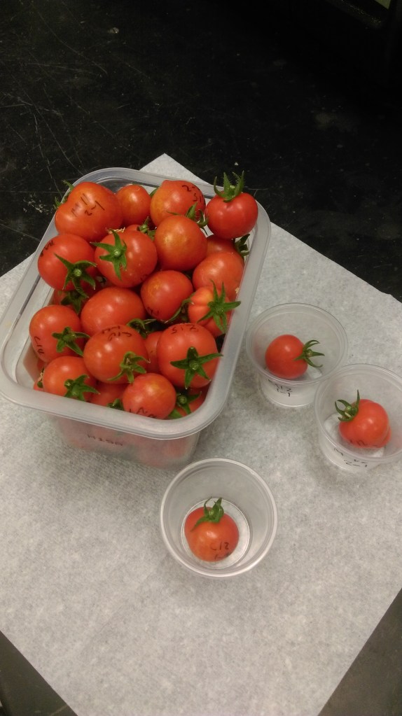 When I was taking care plants for fitness assays, I checked every corner in the greenhouse to make sure there was no way that small animals can get into the space and checked fruits on each plant every day. While I was collecting fruits, I felt that I was like a chipmunk or a squirrel collecting food (tomato) to take to my nest (lab) and store them properly.