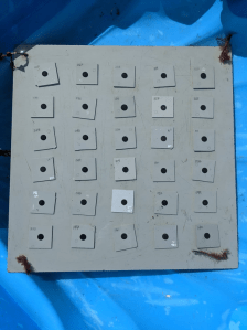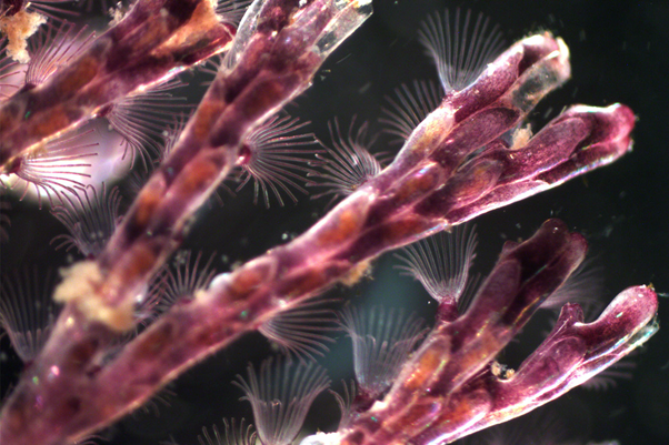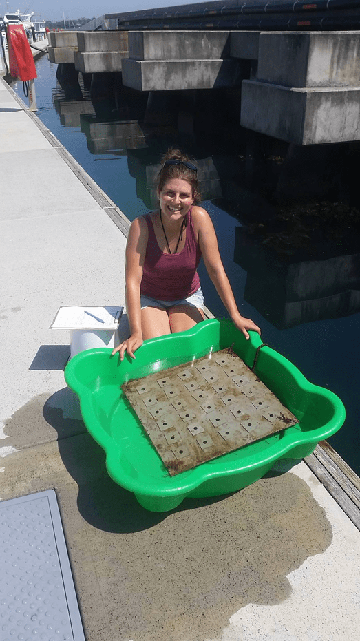 To do this experiment I collected adult colonies of Bugula and spawned them in the lab, before putting the newly settled Bugula back out in the field. Unfortunately, I had to use different sites for collection of adult Bugula and field deployment of newly settled colonies. This was not ideal. The brood stock collection site has reproductive colonies all year round but experimental colonies deployed there suffer mass die off in late summer. In contrast, our field deployment site has few reproductive colonies at certain times of year but colonies survive the high summer temperatures much better. Luckily temperature regimes between the two sites are very similar and show the same trends. So, while imperfect, using two sites enabled me to conduct this experiment year-round.