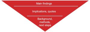 Think of an inverted pyramid with your most important, main findings at the top, then you want the implications of your findings with any relevant quotes and finally the background, methods and next steps. You can think of this like an abstract turned on its head.