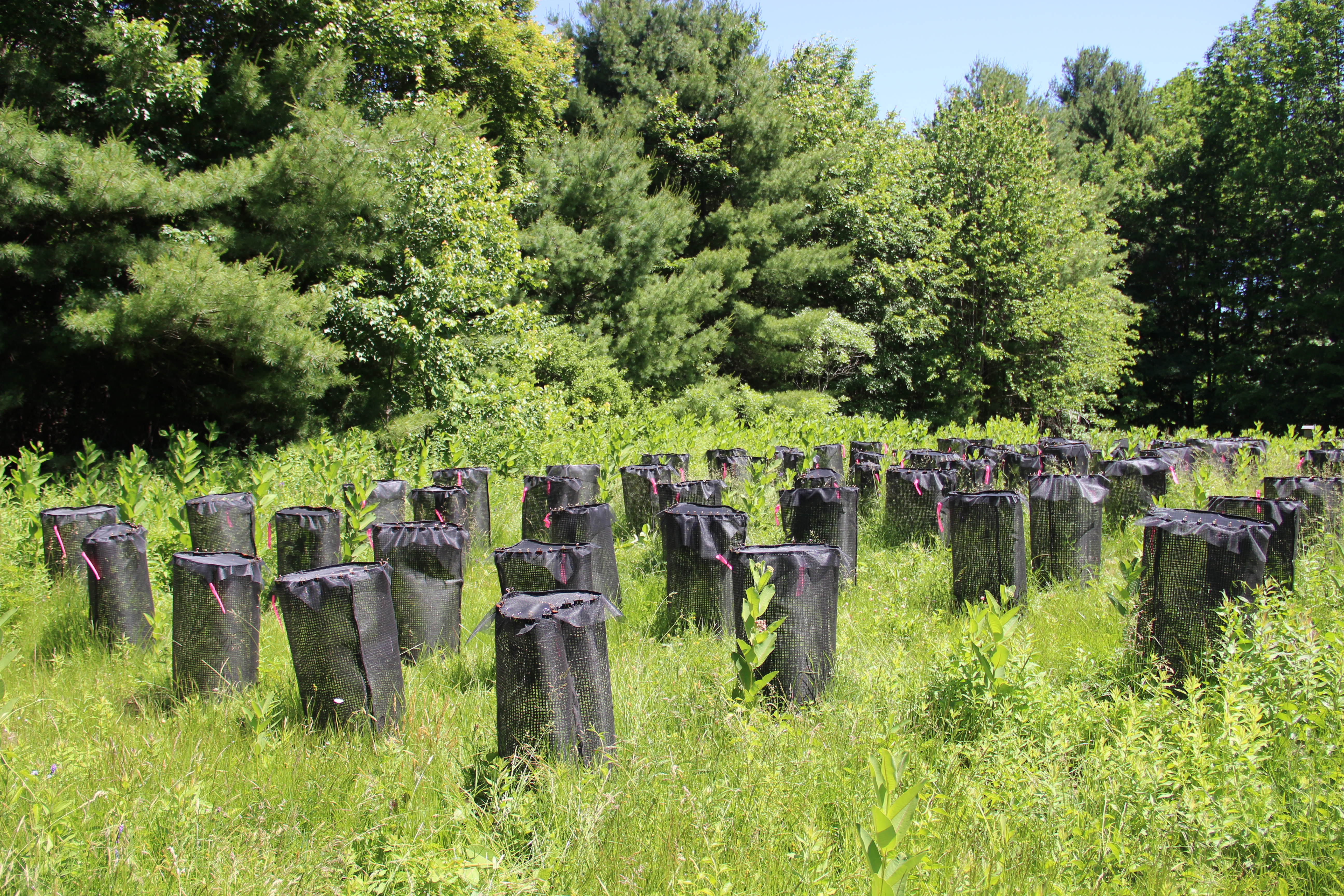 Our experimental cages replicate the design used by my co-author, Os Schmitz, for his work on grasshoppers and spiders, while the belowground part added landscaping cloth to help keep the earthworms out. We built the cages from plastic fencing and window screen curved into long cylinders with screen lids and bases. We dug the holes in which to install the cages using a Ditch Witch and fitted with an 18” auger to rip out the soil. I often say this was the best money I spent as a doctoral student, because I can’t imagine digging all 60 holes by hand. Some wonderful people helped us fill back in the soil once we set the cages. Then we planted rhizomes and seeds in the cages to add back in some plant functional diversity.