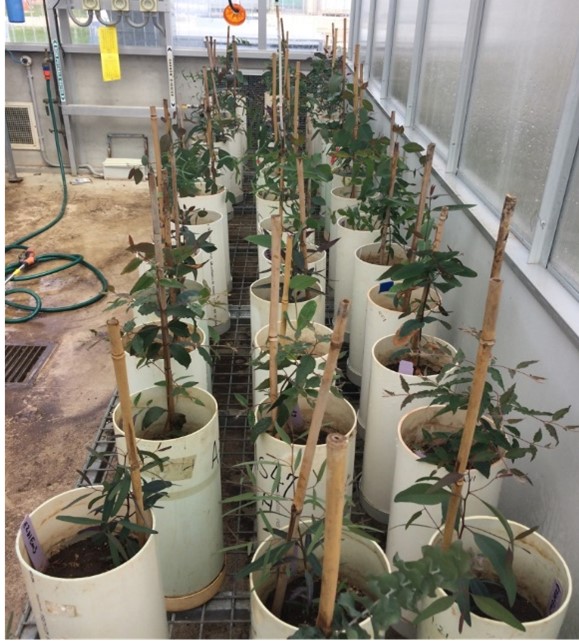 Our work investigated the interacting effects of elevated atmospheric [CO2] (i.e. ‘eCO2’) and drought-like conditions on the seedlings of nine different eucalyptus species. These species represented three distinctive temperate vegetation types with differing moisture regimes, e.g. from wet to dry. We say ‘drought-like’ conditions because in the glasshouse environment it is not a true ecological drought, i.e. a real drought experienced in a natural ecosystem. Rising CO2 levels are a consequence of anthropogenic climate change, and eCO2 is a known driver of increased growth in woody plants. However, there is variability in responses across taxa and there is uncertainty in how other climate change effects, such as increases in drought, may interact with eCO2 to influence plant growth. Variable responses will have consequences for the composition, structure, and function of future plant communities. For example, if drought imposes limitations on eCO2-growth enhancement, will the inherent variation in drought adaptation across species from different environments favour the growth of some species over others? This is a particularly interesting question for landscapes that have a matrix of vegetation types that exist across gradients of moisture availability. How will the vegetative makeup of these landscapes change as the climate rapidly shifts into unknown territory? Fire-prone forest environments that experience episodic drought often contain species with specialised adaptations to store resources that allow regeneration of new foliage following disturbance. If these ‘resprouters’ can utilise eCO2 to more rapidly accumulate resources in the early stages of life as a seedling, then this may give them a better chance of persisting through disturbances.
