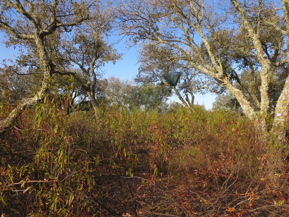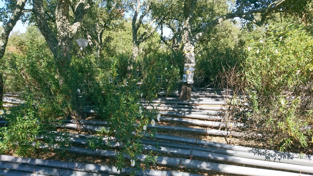 Importantly, these behaviours have long been seen as a fixed trait of plants, which is not strongly modifiable. However, there are some indications that this is not entirely true. Similar to humans—who can change and adapt their behaviour in different environments—we wanted to see if plants are able to do the same. Thus, we chose two Mediterranean plant species growing in the same ecosystem with quite different (supposedly) hydraulic behaviours. The first one—cork oak (Quercus suber)—is an isohydric, water saving tree during drought periods. The second—gum rockrose (Cistus ladanifer)—is a native invasive shrub in cork oak ecosystems and belongs close to the anisohydric extreme. We chose to modify the environment for these two plants to assess their responses—especially for cork oaks—in two ways: 1) we induced additional drought by installing a rain exclusion to simulate climate change; and 2) we were interested in how cork oaks behave when they have to compete for water with invasive shrubs.