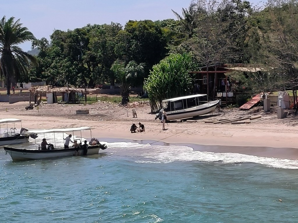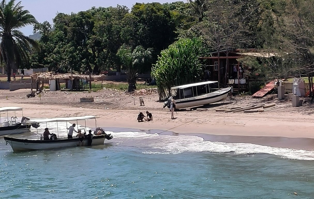 In the backdrop, you can see the dive shop where we readied our diving equipment, alongside the boats responsible for transporting students and staff for the underwater dives (credit: Monica McCard)