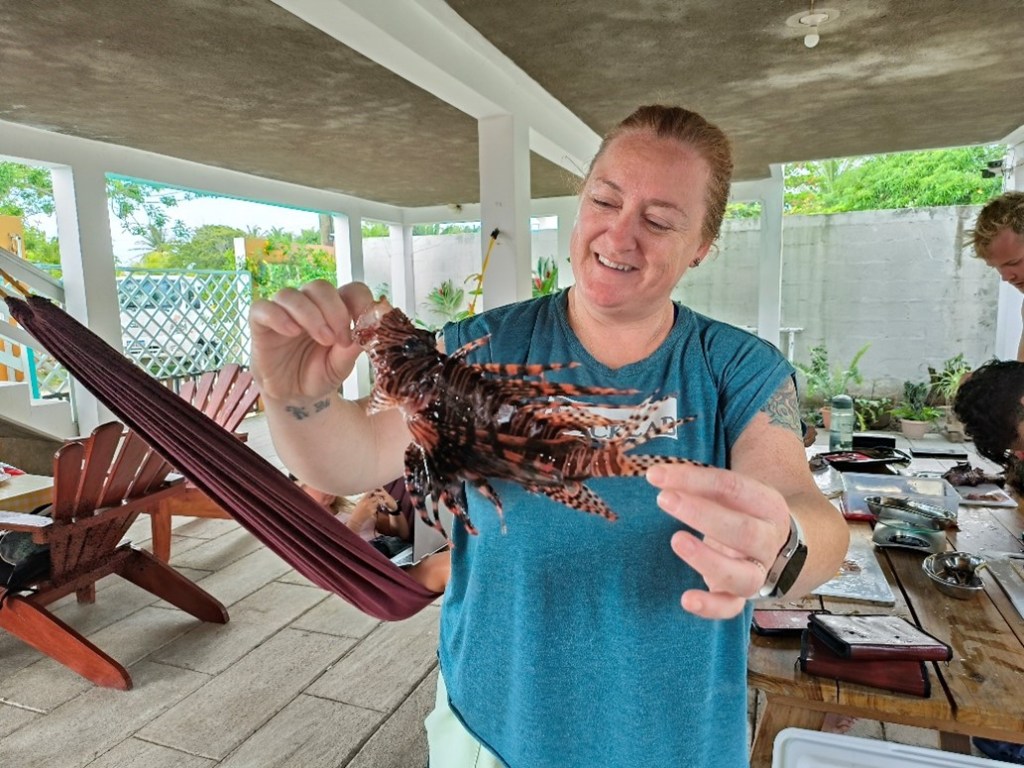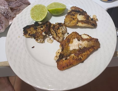 Lionfish has a mild, white, flaky flesh that is considered delicious by many of us who have tried it. Chefs and culinary enthusiasts have the opportunity to create new and unique dishes using lionfish, contributing to culinary innovation and diversifying seafood options. Cooking up lionfish serves as a practical approach to combatting their negative effects, promoting sustainable practices, supporting local economies, and raising awareness about marine conservation. We were lucky to have Kevin the best dive master who cooked lionfish to perfection (credit: Monica McCard)