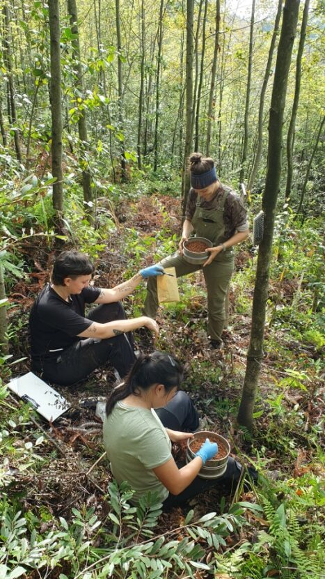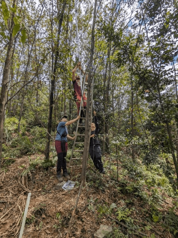 Despite working within an experimental setup, our 20-hectare field site is dominated by slopes. That is why, moving within the experiment, finding our target trees and shrubs among the naturally regrowing plants is the first challenge to overcome. Luckily, we have local helpers to show us the sometimes hidden pathways between different plots. Since we are a big group of PhD students, student helpers, and supervisors, communication across the vast area is challenging—often with no reception—and walkie-talkies were needed. In the case of leaf collection, an additional challenge is the difficulty in accessing some canopies, especially for those trees that, despite their relatively young age, reach up to 20m in height but are too thin to climb. The use of ladders and long leaf cutters are part of our essential equipment in the field. In addition, for soil core collection we are limited by the weather, as wet soil after rain makes it impossible—waiting for dryer conditions is the only option to overcome this. Lastly, there are mining activities near the experimental site—sometimes we have to disrupt our sampling because the mining company schedules blasts and it would be too dangerous to stay in the field.