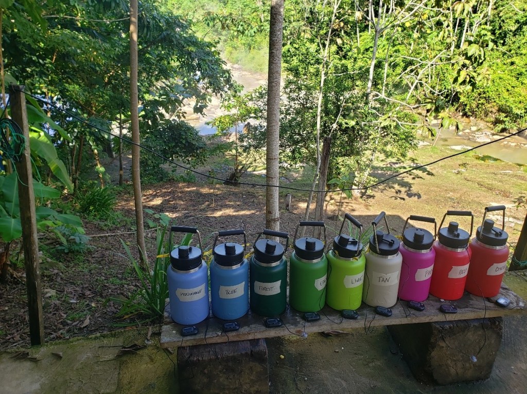 Some of the biggest challenges we faced with this study were the logistical complications at the Boiling River. For example, to measure thermal tolerance, leaves must be heated in water baths to temperatures ranging from room temperature to nearly 70 °C, which typically requires specialized equipment to heat water to specific temperatures, not to mention a lot of electricity. Given that there was no electricity onsite and no nearby facilities, we had to come up with a creative solution to heat our leaves. Our solution was to use hot water from a hot pool of the Boiling River, mixed in differing amounts with room-temperature water to create the desired range of water temperatures. And instead of using a thermostatic mixer to maintain constant water temperatures during the treatments, we used vacuum-insulated water bottles – the same kind that you would use to store a cold refreshment on a hot day.