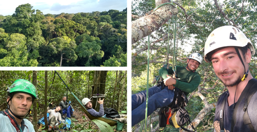 Collecting the data needed to answer our research questions required sampling at multiple heights throughout the forest canopy—a task that requires both determination and courage. Although I was deeply motivated to dive into canopy ecology, I had no previous tree climbing experience—and, even more challenging, I was afraid of heights. Inspired by co-authors who had conducted extensive in-canopy research, Kleber Campos (also a co-author) and I set off for Panamá to attend a specialized canopy access training course. There, we spent 40 days in intensive tree climbing training with Griëtte van der Heide, a renowned tree climber and forest researcher. Armed with new skills and properly certified, Kleber and I returned to our field site near Santarém (Pará, Brazil), where we expanded the research team, and began our journey.